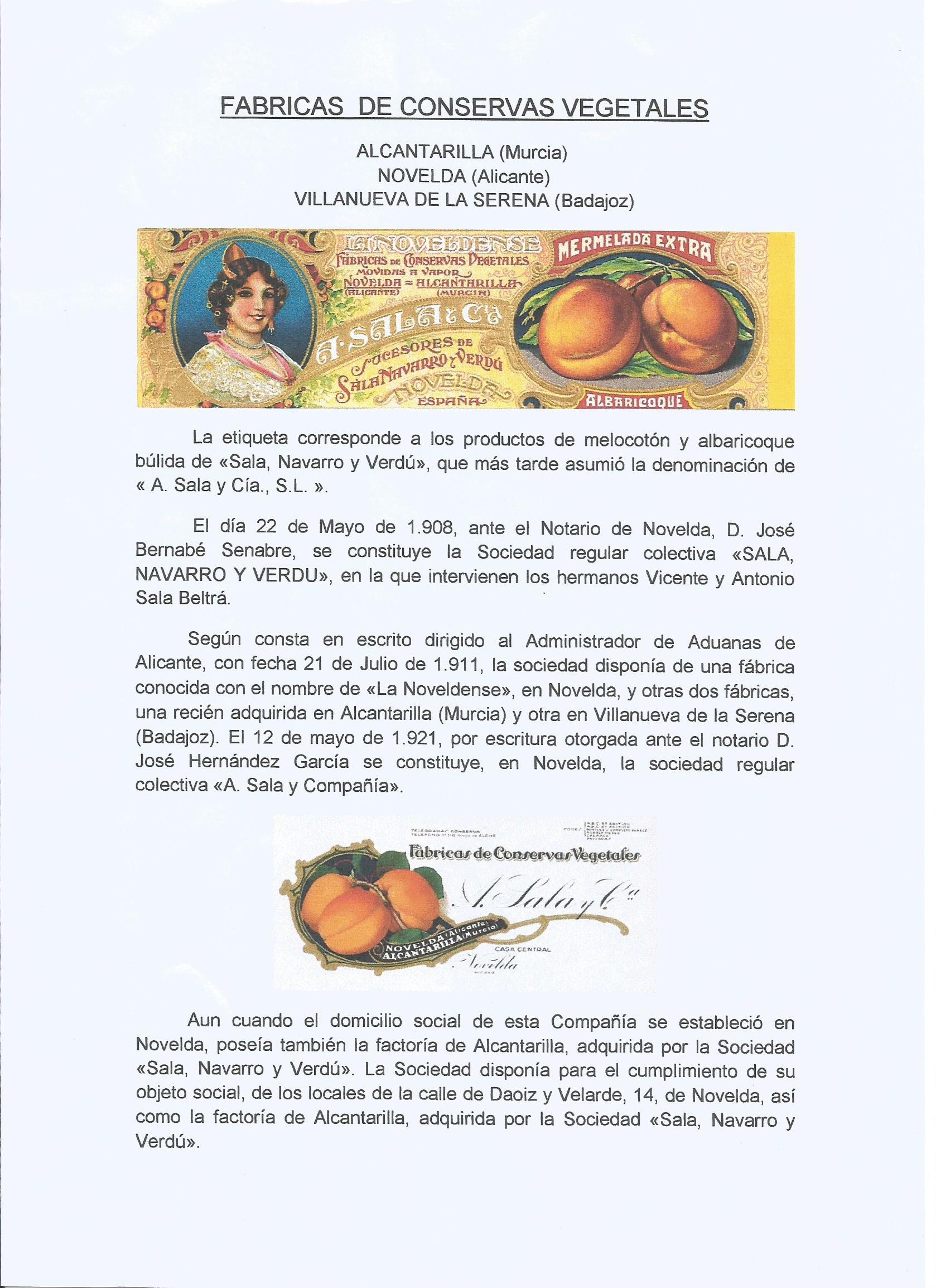 AMADEO SALA Y CÍA, INDUSTRIA CONSERVERA EN NOVELDA (A) - ALCANTARILLA (MU) Y VILLANUEVA DE LA SERENA (BA)
